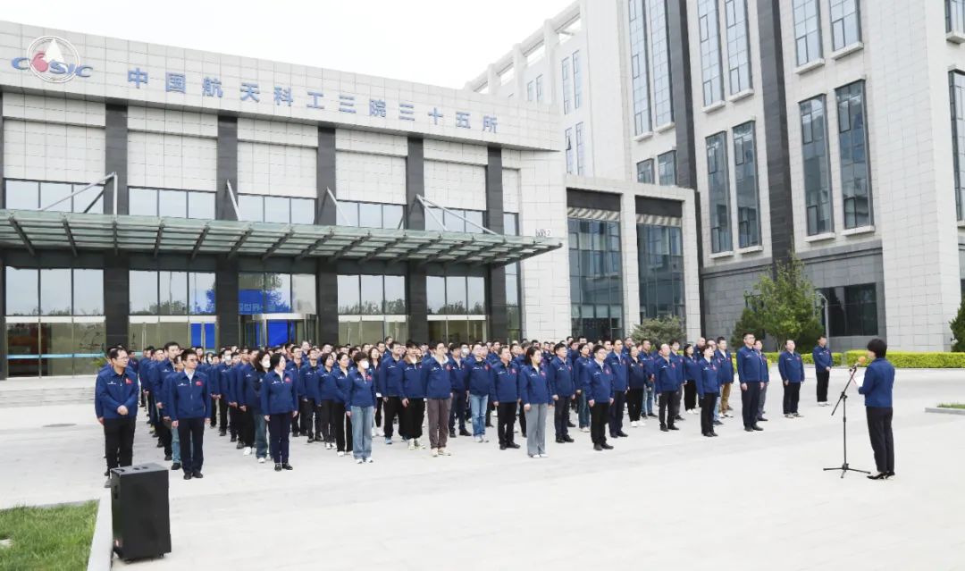 國旗護衛(wèi)隊英姿颯爽、步伐鏗鏘,昂首闊步走向升旗臺。伴隨著雄壯的國歌和航天科工之歌,五星紅旗、集團公司司旗和三院院旗冉冉升起,在場的干部職工肅立行注目禮。