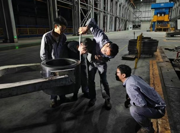 車間內(nèi),叉車的轟鳴奏響了奮斗的旋律。一位叉車司機(jī)熟練地操作設(shè)備,將鍛件穩(wěn)穩(wěn)抓起。4 名技術(shù)、生產(chǎn)骨干迅速圍攏過來,手中的卷尺成為他們攻克技術(shù)難題的有力“武器”。他們專注地測量每一處尺寸,目光在鍛件與測量數(shù)據(jù)間來回切換,不放過任何一個細(xì)節(jié)。