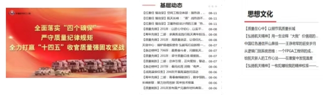 院屬各單位制作航天科工質(zhì)量日電視墻,在北京各工業(yè)區(qū)和成都分中心各科研場(chǎng)所同步播放;組織開(kāi)展質(zhì)量案例分享;以匠心守初心,積極開(kāi)展質(zhì)量信得過(guò)班組、質(zhì)量標(biāo)兵等質(zhì)量先進(jìn)事例和人物宣傳,同時(shí)基于內(nèi)部網(wǎng)站、宣傳欄等多種渠道進(jìn)行廣泛宣傳,弘揚(yáng)優(yōu)秀航天質(zhì)量文化。