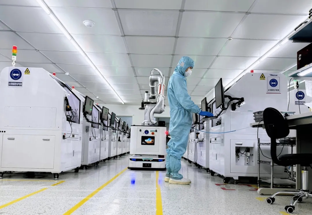 銳科激光智慧光子生產(chǎn)車間,一臺(tái)搭載精密機(jī)械臂的自主移動(dòng)機(jī)器人正沿著預(yù)定路線,緩緩駛向目標(biāo)機(jī)臺(tái)。它精準(zhǔn)??亢?,機(jī)械臂隨即探入設(shè)備內(nèi)部,執(zhí)行夾取、移載、掃碼、上料等系列操作,一氣呵成。操作員李工站在調(diào)度屏前,專注地監(jiān)控著實(shí)時(shí)數(shù)據(jù)。