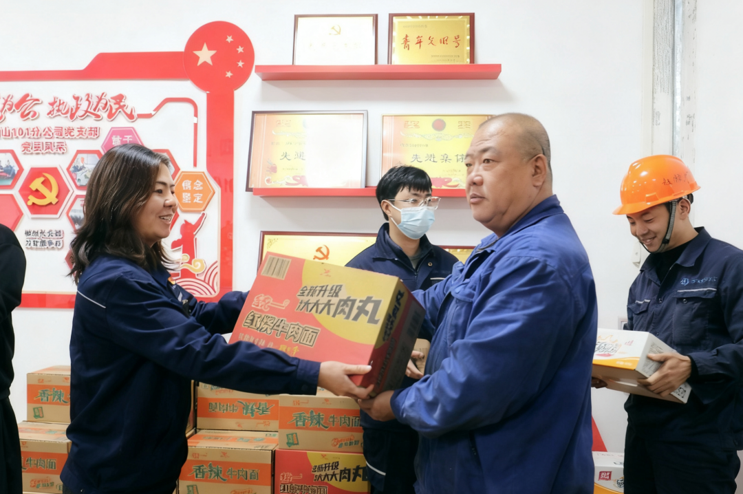 領(lǐng)導(dǎo)帶隊(duì)深入一線,手中是能量滿滿的物資,眼里是對職工們的殷殷關(guān)切。“身體是革命的本錢、吃飽了才有力氣干活”,樸素話語如暖陽,照亮了黑夜,也焐熱了奮斗者的心。