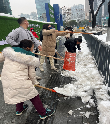 近日,武漢出現(xiàn)寒潮、低溫雨夾雪等冰凍天氣,道路積雪濕滑,給市民出行帶來了極大不便。為有效應(yīng)對雨雪冰凍天氣,全力保障道路暢通和群眾出行安全,中國航天科工財務(wù)公司武漢分公司黨支部積極組織黨員和志愿者參加了由廣發(fā)銀行大廈黨委和北湖街道共同組織開展的“微光成炬 益匯江漢”掃雪除冰志愿服務(wù)。