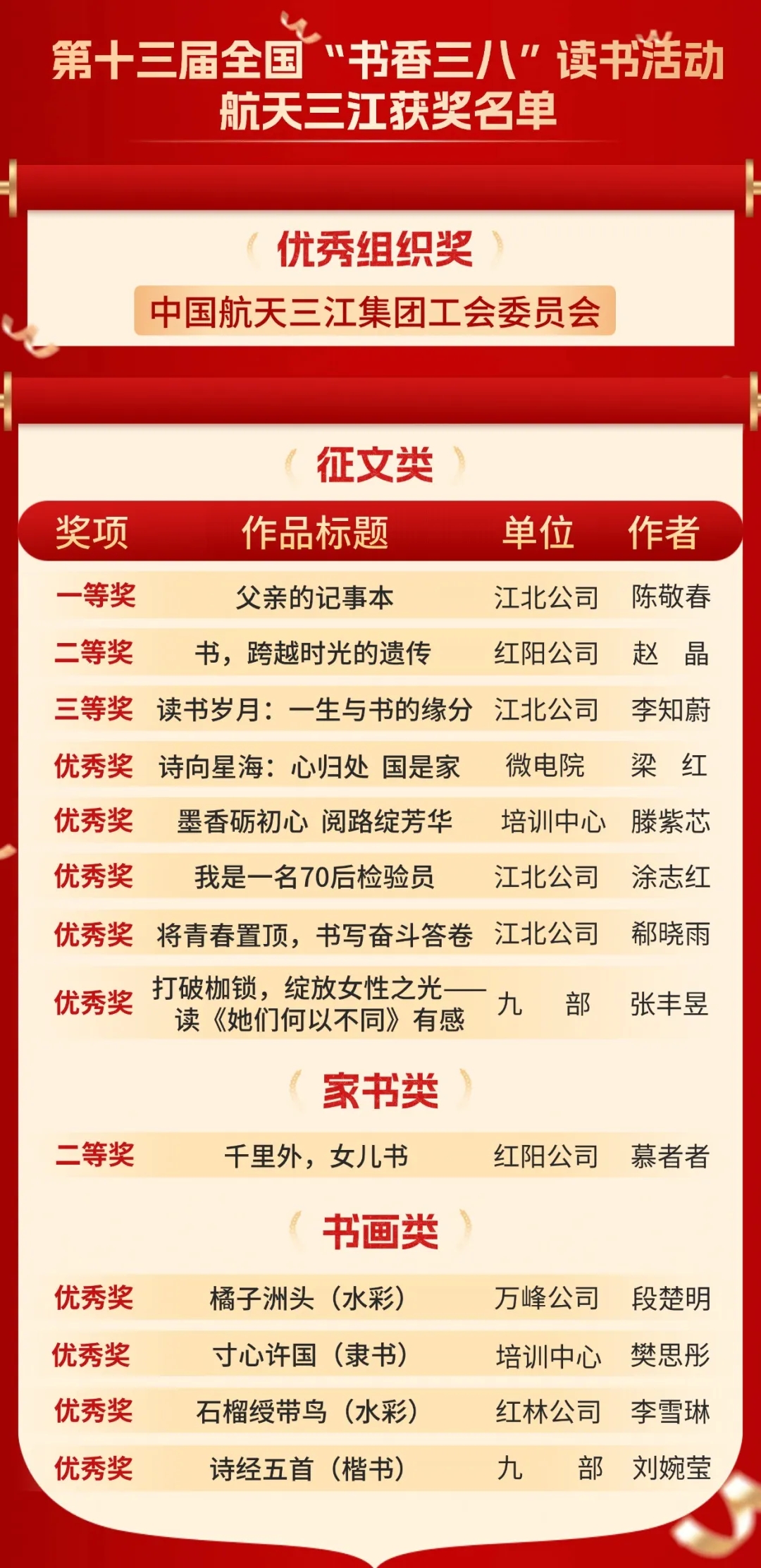11月16日,全國第十三屆“書香三八”讀書活動獲獎名單揭曉,航天科工九院工會榮獲“優(yōu)秀組織獎”,所屬7家單位13名個人作品獲獎。